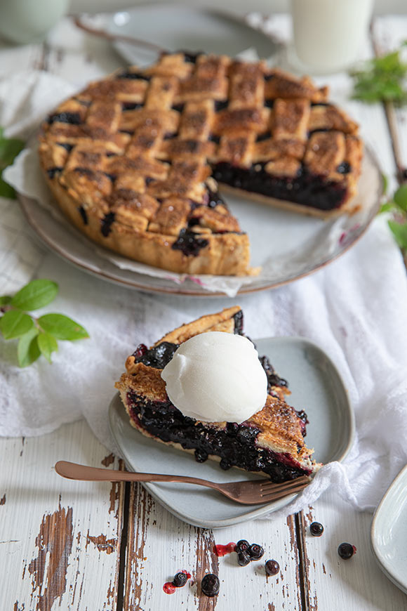 Nappasin varmuudeksi mukaan neljä pussia mustikoita ja kotiin päästessä päätin lyödä ne kaikki kattilaan. Ensin mietin perinteistä pullataikinapohjaan tehtyä piirakkaa, mutta se ei tällä kertaa houkutellut, joten päädyin amerikkaiseen malliin. Halusin silti tuota tuttua mummolamaista makua, joten maustoin pohjan reilusti kardemummalla. Tämä olikin aivan loistava idea, sillä piiraan paistuessa uunista levisi ihana kardemumman tuoksu. Jo piiraan paistumisen odottaminen tuntui ikuisuudelta, mutta maltoin mieleni ja annoin sen vielä jäähtyäkin hetken paiston jälkeen, jolloin tuo ihana täyte pysyi juuri mainiosti piiraan sisällä leikattaessa. Jos siis olet esteetikko ja haluat kauniita paloja, malta mielesi. Jos täytteen valuminen ei ole mielestäsi kovin vakava ongelma, voit aloittaa nauttimisen heti. Ja tarjoiluehdotuksena oleva vaniljajäätelö auttaa myös siihen palaneeseen kieleen.