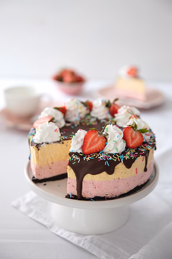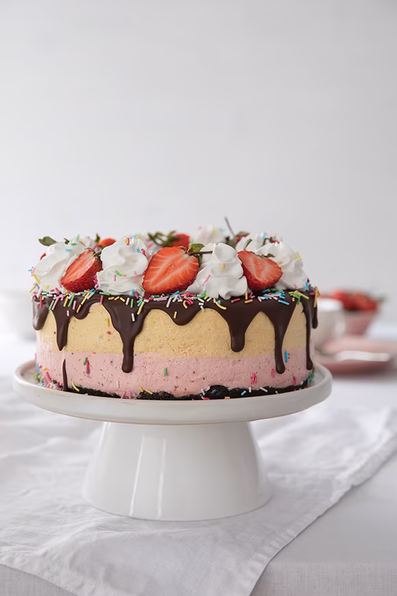 Tämä kakku tuo kesän kylmäänkin talvipäivään. Klassikkojäätelöannoksen maut sisältävä kakku sopii myös vegaaneille.