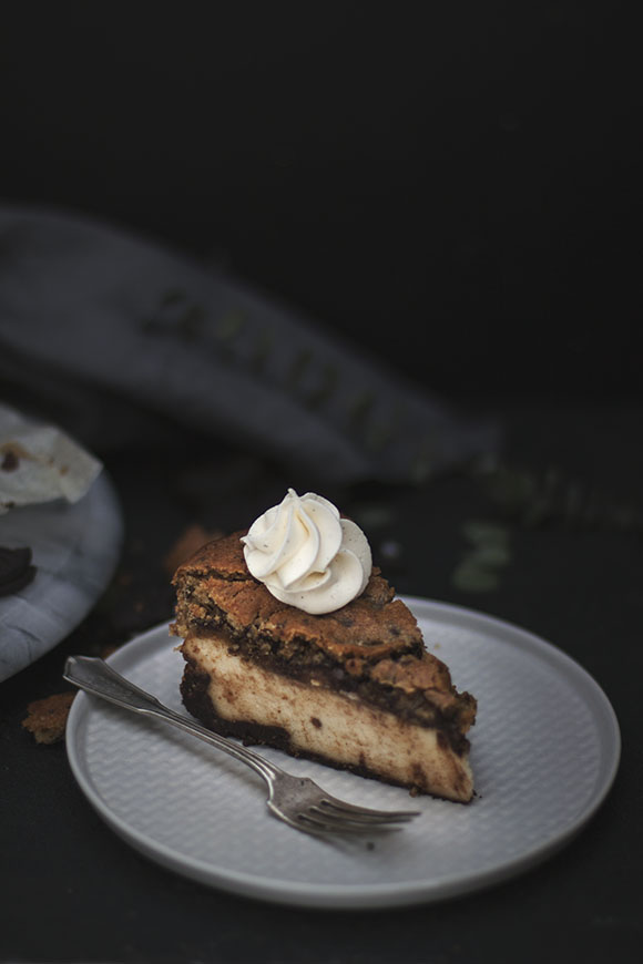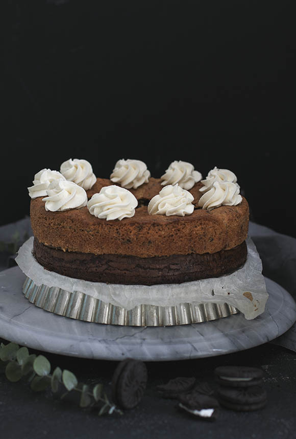 Tastyn videossa kakkuun laitettiin vielä valmiskeksejä, vähän niinkuin slutty browniessa. Päätin kuitenkin jättää ne tällä kertaa pois (jotta leivonnainen pysyy mukavan kevyenä, buahahha). Voit halutessasi lisätä keksejä siis tuohon browniepohjalle ja juustokakun päälle, omasta mielestä se oli kuitenkin tarpeetonta. Tosin keksit pitäisivät tuon brownietaikinan paremmin paikallaan, eikä juustokakkukerrosta tarvitsisi kaataa yhtä varovasti sen päälle. No kekseillä tai ilman, tämä kakku oli todella herkullinen (ja överi).