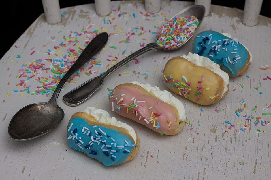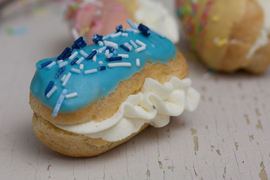 Näitä minieclaireja tehtailtiin viime viikolla lasten kanssa. Eli ei mitään turhaa hienostelua, vaan raikkaita kevätvärejä, strösseleitä ja karkkisia makuja.