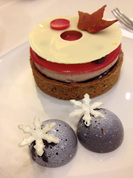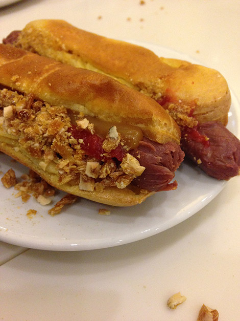 Ehkä mieleenpainuvin herkuista oli kuitenkin tuo aiemmin mainitsemani Dogclair. On todella hämmentävää syödä leivosta, joka tosiaan näyttää ihan hodarille. Maku oli kuitenkin kaukana siitä. Tuulihattusämpylän väliin laitettu suklaaparfait-nakki, mansikkapyree ketsupilla ja tyrni-valkosuklaa sinapilla. Päälle vielä manteli-pähkinänougata sipulirouheeksi, niin herkku on täydellinen. Tämä oli aivan mahtava toteutus ja osoitti kyllä tekijältään loistavaa uskallusta ja huumorintajua. Halukkaat voivat kokeilla reseptiä kotona, se löytyy täältä. Laittakaahan runsaasti ketsuppia.