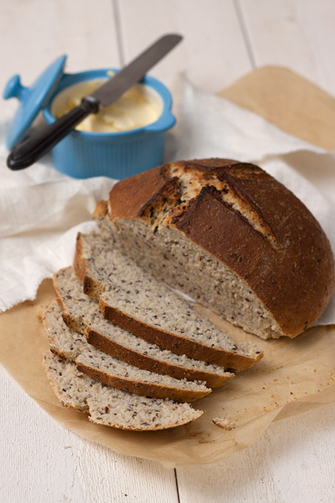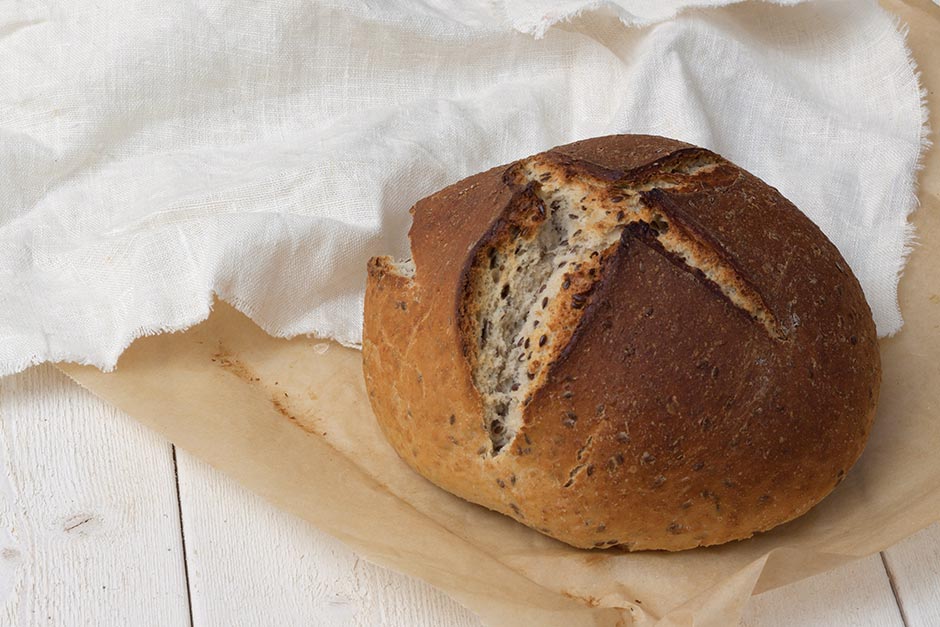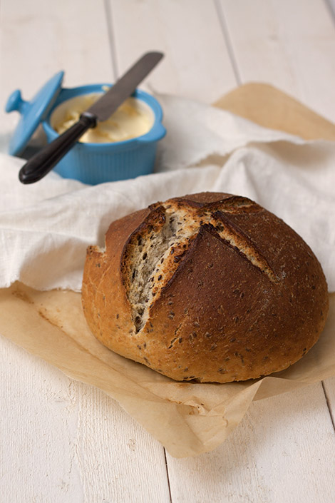 Leivo taikina leiväksi ja kohota pellillä vielä noin 1 1/2 tuntia. Tee leivän pintaan viillot terävällä veitsellä. Paista vajaa 200-asteisessa uunissa noin 25 minuuttia, kypsä leipä kumisee pohjaan koputeltaessa.