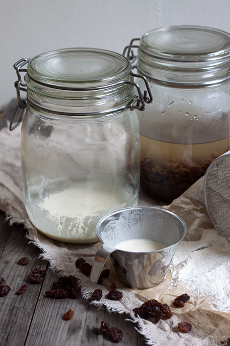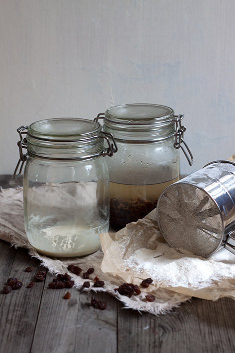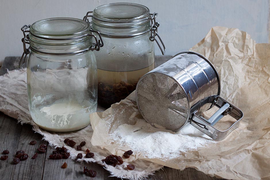 Sekoita vehnäjauhot ja vesi noin 1 litran vetoisessa lasipurkissa. Peitä kevyesti kannella (älä käytä tiivistettä kannen välissä). Anna seistä huoneenlämmössä seuraavaan päivään.
