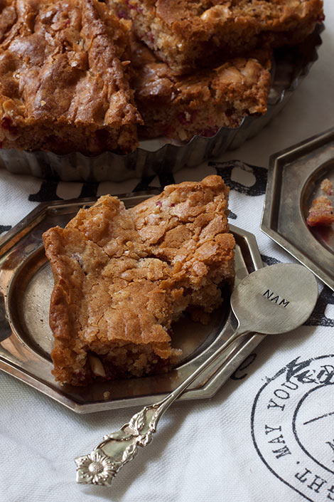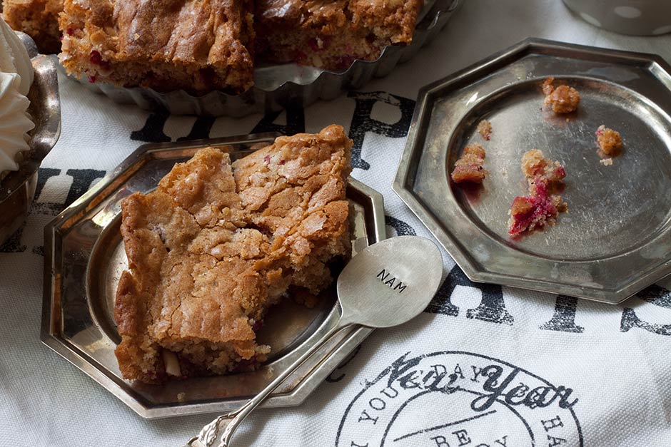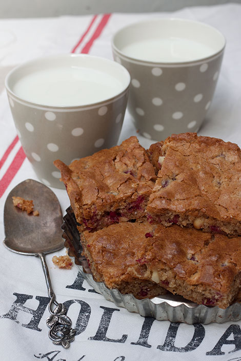 Lauantai aamu alkaa makeasti blondiella, sillä 3. luukun resepti on viime syksynä ilmestyneestä Leivontakirja Makeasta. Tämä ihanasti joululta maistuva blondie valmistuu helposti ja vain paranee oleskeltuaan yön yli jääkaapissa. Blondien parina voi tarjota jäätelöä, mutta se ei ole lainkaan välttämätöntä, tämä maistuu loistavalta sellaisenaankin. Valkosuklaisen makea blondie saa pientä kirpeyttä puolukoista, jotka tasapainottavat muuten niin makeaa leivosta.