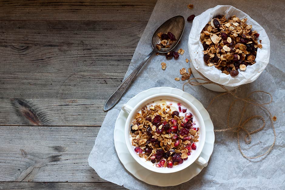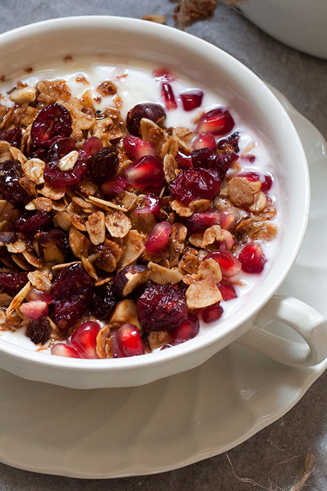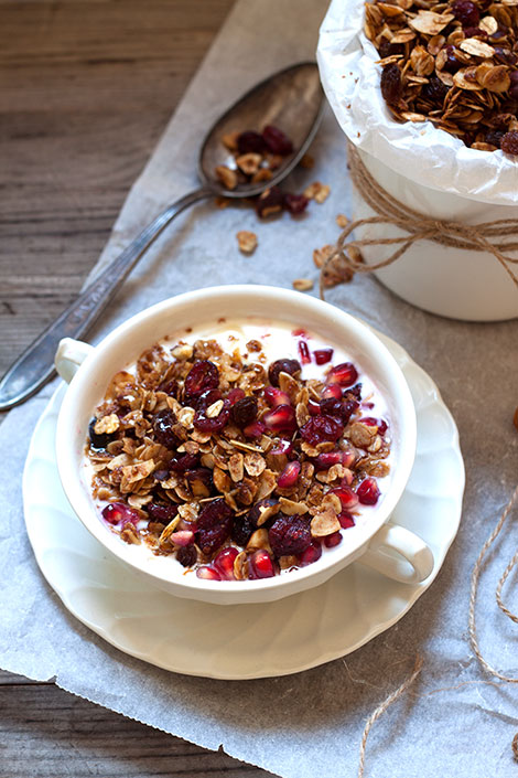 Jos riisipuuro ei aattoaamuna maistu, tästä myslistä saa loistavaa energiaa päivään. Ihanan värikkäillä granaattiomenan siemenillä maustettu mysli on hyvää vaihtelua perinteisiin ja jos pidät sekä puurosta, että myslistä voit kokeilla ripotella mysliä myös puuron päälle. Yhdistelmä saatta kuulostaa oudolta, mutta on todella herkullista.