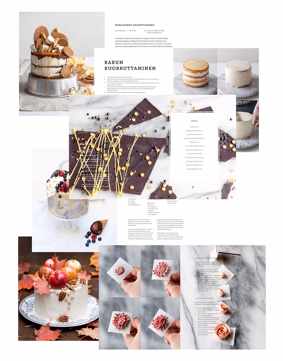 Kirjasta löytyy 51 erilaista kakkureseptiä. Useita reseptejä voit myös yhdistellä uusiksi kokonaisuuksiksi vaihtamalla pohjaa, täytettä tai kuorrutetta kakkujen välillä. Varsinaisten reseptien lisäksi keräsin kirjaan paljon käytännön vinkkejä. Kuvalliset ohjeet auttavat pohjan valmistamisessa, kakun kuorruttamisessa, sokerimassan käsittelemisessä, koristeiden sommittelussa ja erilaisten koristeiden valmistamisessa.