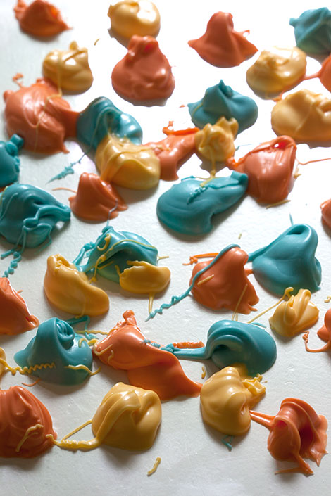 • Erivärisiä candy melts -nappeja tai värjättyä valkosuklaata (yht. noin 60 g)