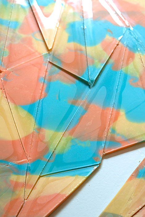 Sulata napit omissa kulhoissaan mikroaaltouunissa. Nostele lusikalla kasoja kalvon päälle (kts. kuva alla). Levitä kasat palettiveitsellä kevyesti tasaiseksi. Pinta saattaa sekoittua, mutta kalvoa vasten oleva puoli pysyy  kuviollisena. Anna suklaan asettua ja leikkaa kolmioksi. Irrota kalvo. Lastut säilyvät huoneenlämmössä ilmatiiviissä rasiassa.