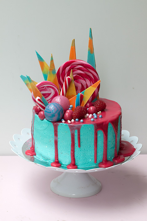 Tämä kakku on ollut suunnitteilla jo kauan. Olen nimittäin jo pitkään ihastellut instagramissa Australialaisen Katherine Sabbathin kakkuja, jotka pursuavat kirkkaita värejä, karkkeja, marenkeja, suklaata, strösseleitä ja valuvaa ganachea. Sabbathin tyyli on kaikista väreistään huolimatta herkullinen ja kakut näyttävät syötävän hyviltä. Tällainen koristelutyyli tuo hauskaa vaihtelua perinteisiin massa- ja kermakakkuihin ja koska itse olen enemmän kreemien ystävä, tämä sopii minulle mainiosti. Sinisen kuorrutteen ja pinkin ganachen yhdistelmä on aivan ihana, mutta jos kakusta ei halua näin räikeää vaaleammat ja luonnollisetkin värit toimivat upeasti.