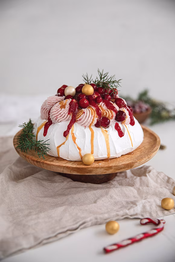 Vatkaa kerma, mascarpone ja vanilja kuohkeaksi vaahdoksi. Kääntele joukkoon 3 rkl karpalososetta. Lusikoi tai pursota täyte marenkipohjalle. Viimeistele pavlova karpalososeella, toffeekastikkeella, karpaloilla ja suurilla koristekuulilla.