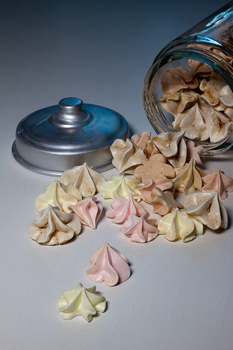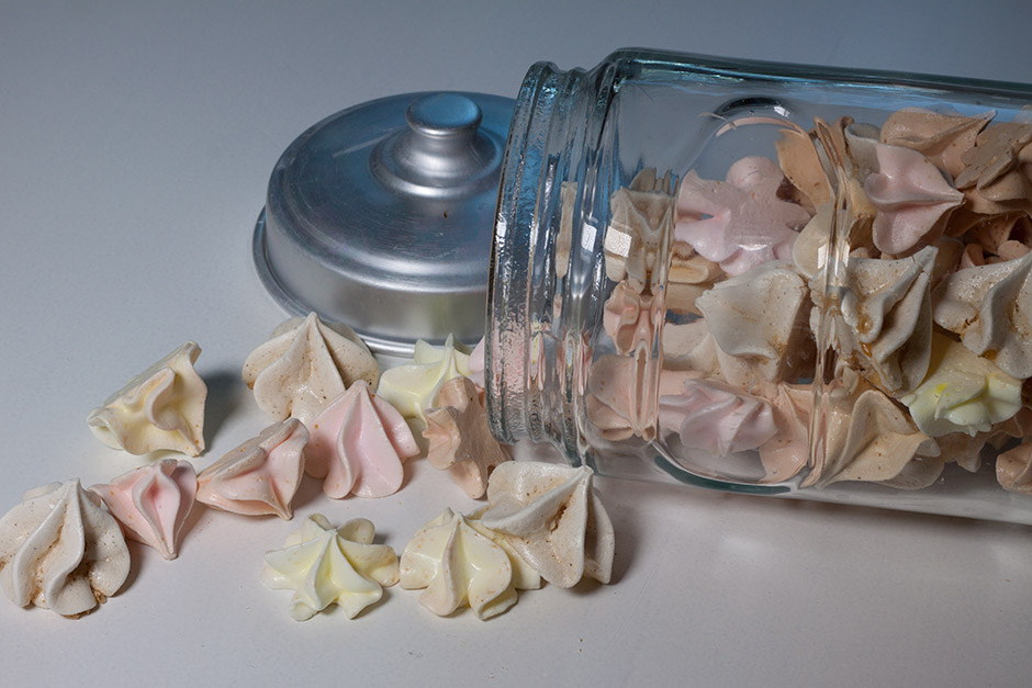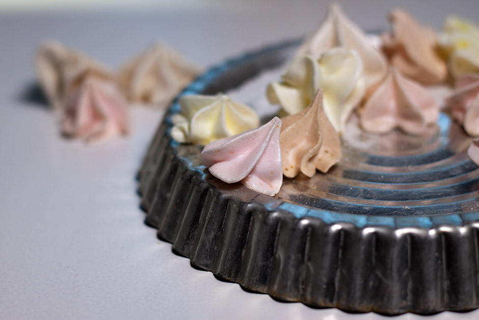 Lämmitä uuni 110 asteeseen. Vuoraa kaksi uunipeltiä leivinpaperilla. Vatkaa valkuaiset töpäkäksi vaahdoksi. Lisää sokeri pienissä erissä. Vatkaa kunnes vaahtoon muodostuu teräviä huippuja ja kaikki sokerikiteet ovat sulaneet. Jaa vaahto kolmeen osaan (tai niin moneen, kuin sinulla on eri makuvaihtoehtoja). Mausta kukin osa noin 1/4 tl kool-aid-jauhetta. Itse käytin myös puhdasta vaniljajauhetta yhteen osaan, joten sain vähän luonnollisempiakin makuja aikaiseksi.