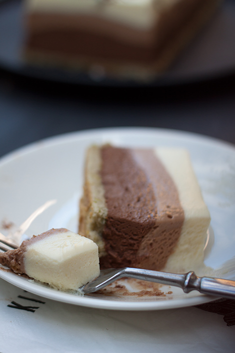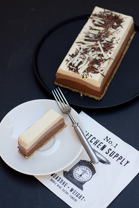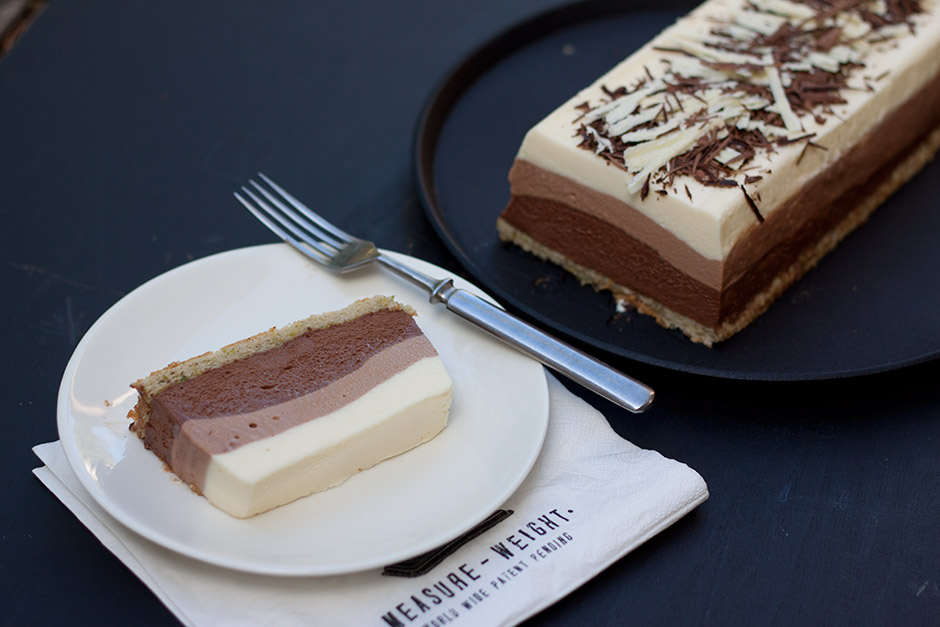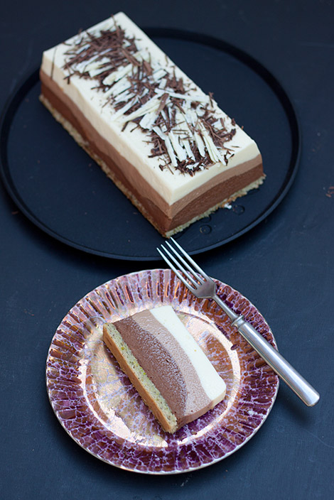 Jaa mousse kolmeen osaan. Sekoita ensimmäiseen osaan valkosuklaa ja kaada seos suorakaiteen mallisen vuoan pohjalle. Sekoita toiseen osaan maitosuklaa ja kaada varovasti valkosuklaamoussen päälle. Sekoita viimeisenä tumma suklaa kolmanteen osaan moussepohjaa. Nostele seos varovasti maitosuklaamoussen päälle ja tasoita pinta kevyesti. Asettele sopivaksi leikattu kakkupohja moussejen päälle ja laita kakku hyytymään kylmään. Kiireessä voit hyydyttää kakun pakastimessa noin tunnissa, jääkaapissa hyytyminen kestää luonnollisesti pidempään.