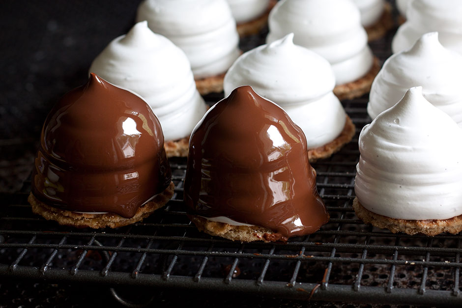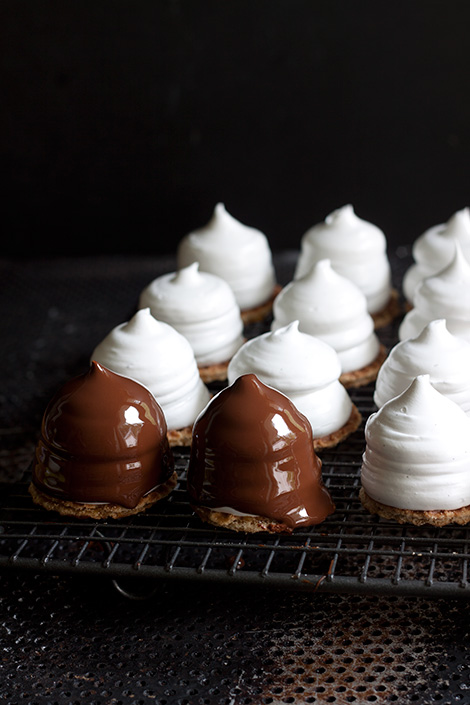 Rapean suklaakuoren alta paljastuu samettisen pehmeää sveitsiläistä marenkia, joka on maustettu aidolla vaniljalla. Nämä suukot muistuttavat Brunbergin perinteisiä pusuja, mutta maun voi muokata juuri omaan makuun sopivaksi. Massaa voi maustaa erilaisilla aromeilla ja sitrushedelmien kuorilla. Näissä pusuissa pohjana toimivat Tigerista löytämäni pienet belgialaiset vohvelit, jotka sisälsivät hunajatäytettä. Vohvelit olivat hieman sitkeitä, mutta maistuivat todella herkullisilta. Pusuihin sopii loistavasti pohjaksi myös muro- ja kaurakeksit ja joulun kunniaksi kannattaa kokeilla myös piparkakkuja.