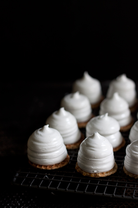 Mittaa täytettä varten valkuaiset, sokeri ja sitruunamehu kuumuutta kestävään kulhoon. Aseta kulho vesihauteeseen, niin ettei vesi osu kulhon pohjaan. Vatkaa valkuaisia vesihauteessa, kunnes vaahdon lämpötila on noin 65 astetta. Jos et omista sokerilämpömittaria voit kokeilla hieroa vaahtoa sormien välissä. Se on valmista, kun kaikki sokerikiteet ovat sulaneet ja vaahto tuntuu sileältä. Ota kulho vesihauteesta ja vatkaa vaahto huoneenlämpöiseksi. Halkaise vaniljatanko ja raaputa siemenet vaahdon sekaan. Sekoita, jotta siemenet leviävät tasaisesti. Siirrä vaahto pursotinpussiin ja pursota heti pohjien päälle. Anna asettua jääkaapissa noin tunti ennen kuorruttamista.