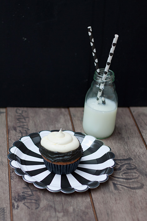 Sekoita voi, tomusokeri ja sitruunankuori tasaiseksi. Lisää tuorejuusto ja vatkaa kouhkeaksi, noin 5 minuuttia. Siirrä kuorrute pursotinpussiin ja pursota jäähtyneiden kuppikakkujen päälle. Valuta päälle halutessasi vielä lisää lakritsikuorrutetta.