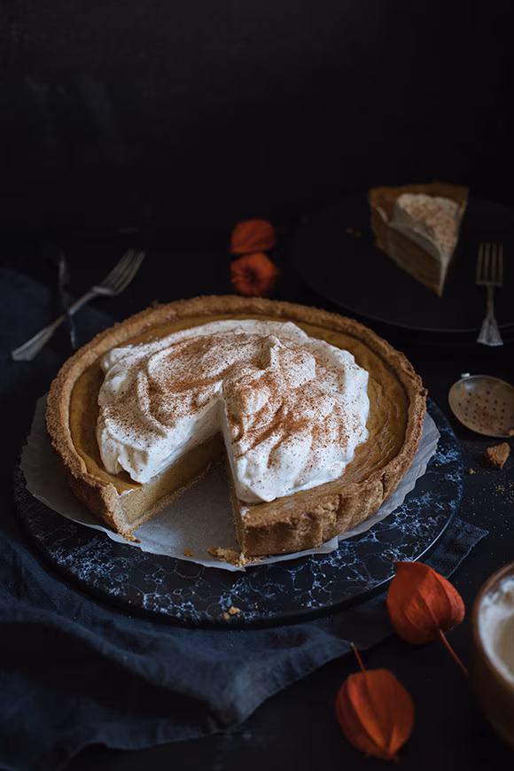 Vaahdota kerma, sokeri ja mausteet kuohkeaksi vaahdoksi. Tarjoile piirakka vaahdon ja piparinmurujen kanssa.