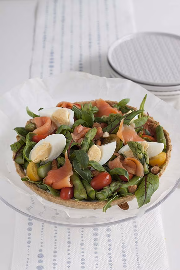 Vappupöydän salaattipiirakka kasataan tietenkin parasta satokautta nauttivasta parsasta. Parsan pariksi sopivat loistavasti kylmäsavulohi ja kananmuna tai vaikka ilmakuivattu kinkku. Piirakka toimii erinomaisesti myös vegaanisena ja täytteitä on muutenkin helppo muunnella omien mieltymysten mukaan.