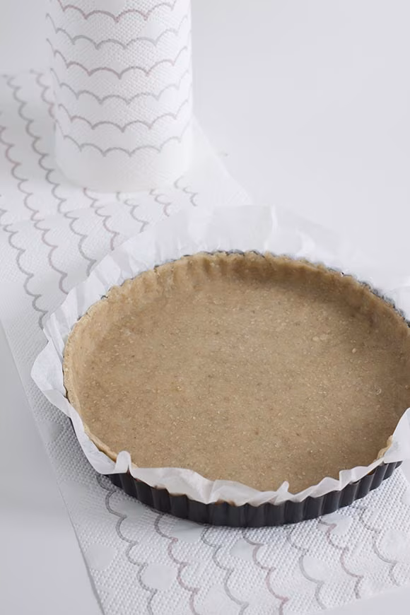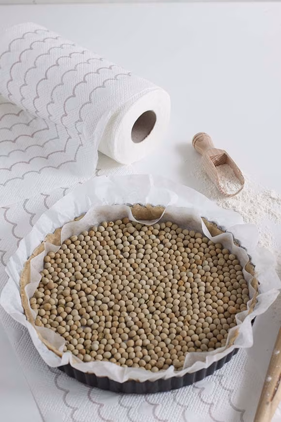 Kuumenna uuni 200 asteeseen. Kauli taikina ohueksi levyksi ja asettele se leivinpaperilla vuorattuun piirakkavuokaan. Aseta toinen leivinpaperi taikinan päälle ja täytä esimerkiksi kuivatuilla herneillä. Paista noin 15 minuuttia. Poista herneet ja paista vielä noin 5–10 minuuttia tai kunnes pohja on saanut kauniin paistovärin. Anna jäähtyä ja irrota pohja vuoastaan.