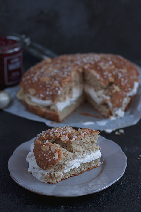 Halkaise jäähtynyt pulla varovasti kahteen osaan. Levitä väliin mantelimassa tai hilloa ja kermavaahtoa. Nosta kansi täytteiden päälle. Jos haluat tehdä leikkaamisesta siistimpä, leikkaa kansi annospaloihin jo ennen pullan päälle nostamista. Kokoa kansi pullan päällä takaisin yhteen.
