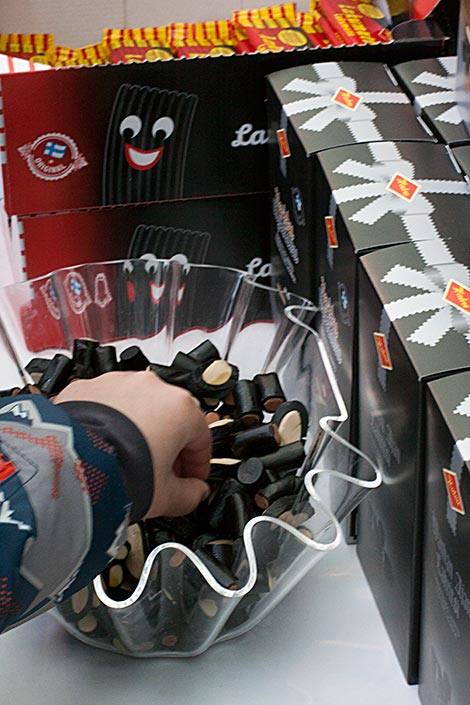 Vatsan täytyttyä ja verenpaineen vähitellen kohottua päätimme kerätä mukaan sopivat messutuliaiset. Monien mahdollisuuksien joukosta mukaan valikoituivat heti ensimmäiseltä tiskiltä vastaan tulleet piparkakkukuorrutteiset lakritsikonvehdit, Halvan x-salt salmiakit, Kouvolan lakupiiput ja nippu lakritsijuuria ja -tankoja, jotka päätyvät myöhemmin leivontatestaukseen.