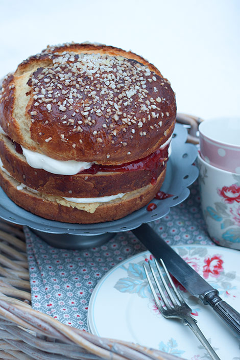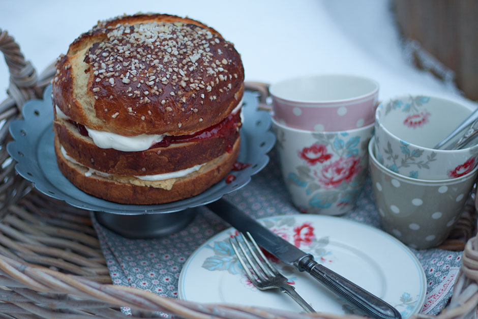 Laskiaispullat ovat todella herkullisia, mutta tälle vuodelle halusin keksiä niihin taas jotain uutta. Edellisvuosina olen leikkinyt täytteen kanssa ja lemon curdillä ja kermavaahdolla täytetyt pullat ovat nousseet suosikeiksini. Nyt pitäydyin perinteisissä täytteissä, mutta tällä kertaa en päätynytkään laskiaisen tärkeimmän kysymyksen äärelle, eli mantelimassalla vai hillolla, vaan yhdistin rohkeasti molemmat. Muoto sen sijaan koki todellisen uudistuksen. Saanen esitellä laskiaispullakakku.