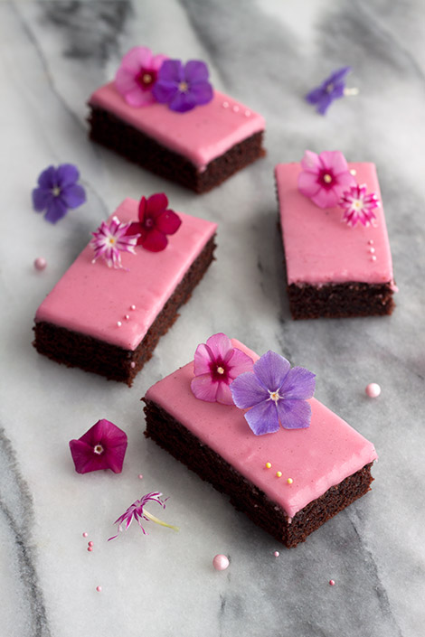 Perusmokkapalat olisivat kuitenkin olleet mansikkaista kukkakakkua toivovalle tytölle pettymys, joten päätin turvautua kaapissa odotelleeseen mansikkatomusokeriin. Kokeilin tuota sokeria jo aiemmin ja siitä saa maun lisäksi kivaa väriä. Maku on hyvin karkkinen ja voimakas, joten laimensin sitä hieman tavallisella tomusokerilla. Suklaiset palat saivatkin suloisen pinkin kuorrutteen ja tyttö oli todella tyytyväinen. Vielä kun jääkaapissa odotelleet mimis versojen syötävät leimunkukat nostettiin esiin oli herkku niin täydellinen, että se kuljetettiin suoraan nukkejen kahvikutsuille.