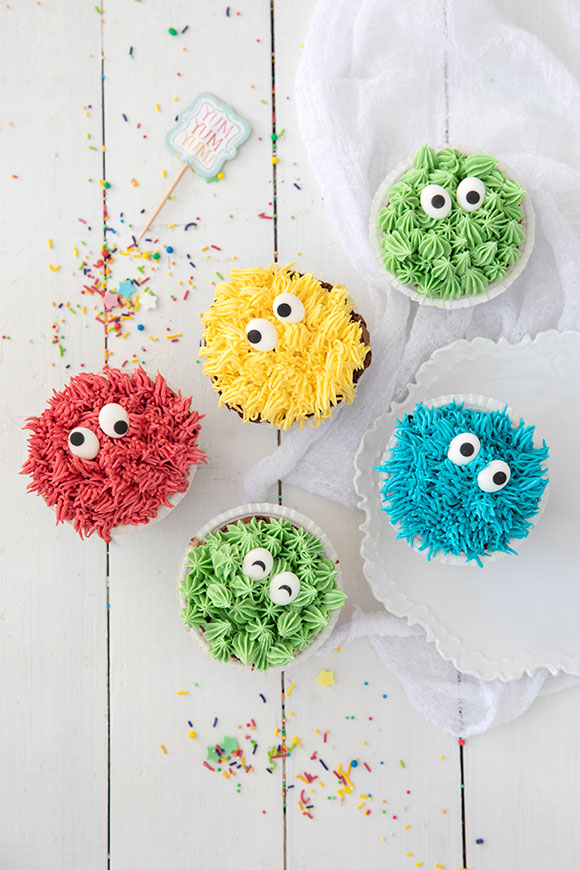 Vatkaa huoneenlämpöinen voi vaaleaksi, kuohkeaksi vaahdoksi. Siivilöi joukkoon tomusokeri ja vanilja. Jatka vatkaamista vielä muutama minuutti. Jaa kuorrute neljään osaan. Värjää osat eri väreillä ja siirrä ruoho- tai tähtityllilla varustettuihin pursotinpusseihin. Pursota kuorrutetta muffineille ja viimeistele koristesilmillä.