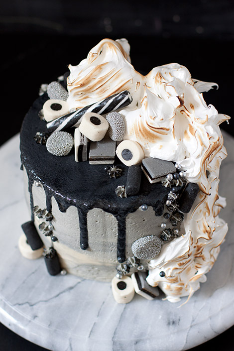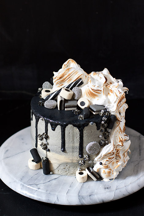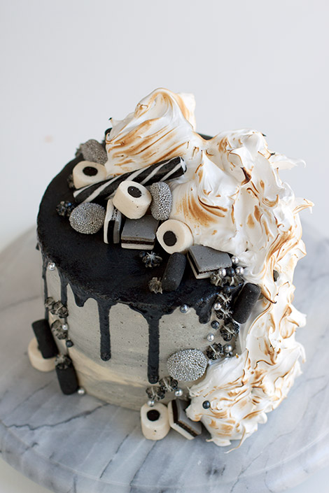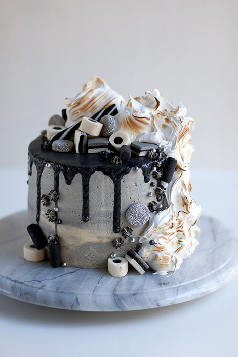Mietittiin lasten kanssa makuja ja koko perheen suosikki lakritsi valikoitui ehdottomasti mukaan. Makupariksi valitsin tällä kertaa vadelman, jotta kakku maistuisi hieman perinteisempienkin makujen ystäville. Lakritsin ja vadelman yhdistelmää on tullut käytettyä monesti, mm. tämä kakku on noussut yhdeksi suosikeistani. Koristeluun olin saanut idean jo viikkoja sitten kun äitini oli löytänyt läheisestä karkkikaupasta musta-valko-hopeisia Englannin lakuja. Lakut olivat niin upeita, että päätin tehdä koko kakun niiden sävyyn. Pelkät lakut kakun päällä olisi kuitenkin näyttäneet tylsältä, joten kakkuun oli keksittävä jokin korkeampi elementti tasapainottamaan kokonaisuutta. Kermavaahtoa en kakun päälle halunnut, joten päädyin sveitsiläiseen marenkiin, jonka ruskistin vielä kaasupolttimella.