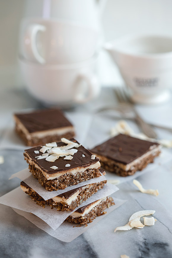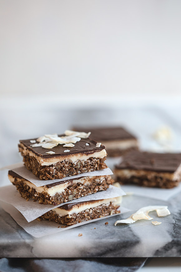 Nämä nanaimo-palat ovat juuri sellainen täydellisesti pakastamiseen soveltuva herkku, jota on helppo kaivaa esiin yllätysvieraiden saapuessa. Toisaalta, koska kukaan ei ainakaan Helsingissä tunnu enää yllätyskyläilevän, jää syötävää enemmän itselle. Palat sulavat nopeasti huoneenlämmössä, mutta salainen paheeni on syödä niitä hieman jäisenä suoraan pakastimesta. Murumaisen pohjan ansioista nämä eivät pakastu kivikoviksi, vaan niitä on oikein helppo haukkailla jäisenäkin. Vaniljakreemitäyte maistuu jäisenä hieman jäätelöltä, joten miksi odottaa sulamista?