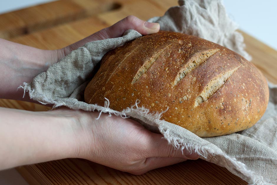 Ota leipä jääkaapista ja lämmitä uuni 200 asteeseen. Tee leivän pintaan viillot, jotta leipä pääsee kohoamaan tasaisesti. Laita leipä uuniin ja heitä mukillinen vettä uunin pohjalle. Sulje luukku nopeasti, jottei syntyvä vesihöyry karkaa uunista. Paista leipää noin 20-30 minuuttia tai kunnes se tuntuu kevyeltä ja kuulostaa ontolta pohjaan koputettaessa.