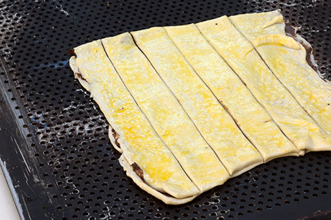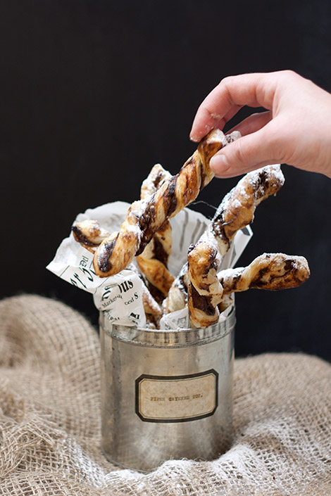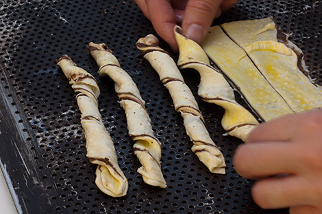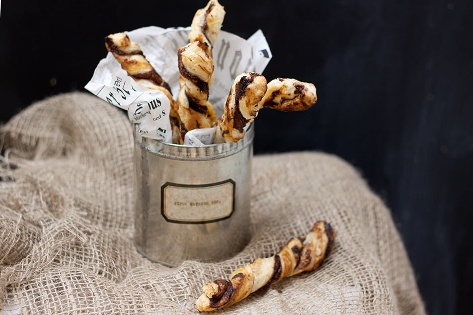 Anna torttutaikinalevyjen sulaa huoneenlämmössä. Kauli levyt noin kaksinkertaiseksi. Voitele levyt Nutellalla. Taita levy kaksinkerroin pituussuunnassa. Voitele kananmunalla. Leikkaa levy kuudeksi suikaleeksi. Tartu suikaletta molemmista päistä ja pyöritä päitä eri suuntiin, jotta saat aikaan napakan kierteen. Paista kierteitä 225 asteisessa uunissa noin 10 minuuttia. Sihtaa päälle tomusokeria.