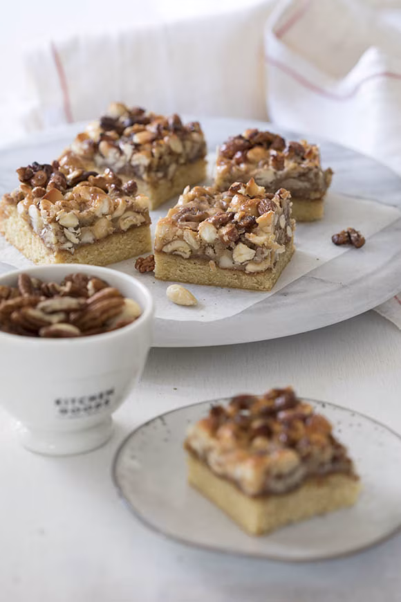 Hienonna pähkinät karkeasti veitsellä. Mittaa kaikki kuorrutteen ainekset kattilaan ja anna kiehua hiljalleen varovasti sekoitellen, kunnes seos sakenee hieman. Levitä kuorrutus pohjan päälle ja paista 225 °C:ssa kunnes pinta on saanut kauniin värin. Piirakka palaa loppuvaiheessa nopeasti, joten tarkkaile sitä paiston ajan. Anna jäähtyä ja tarjoile.