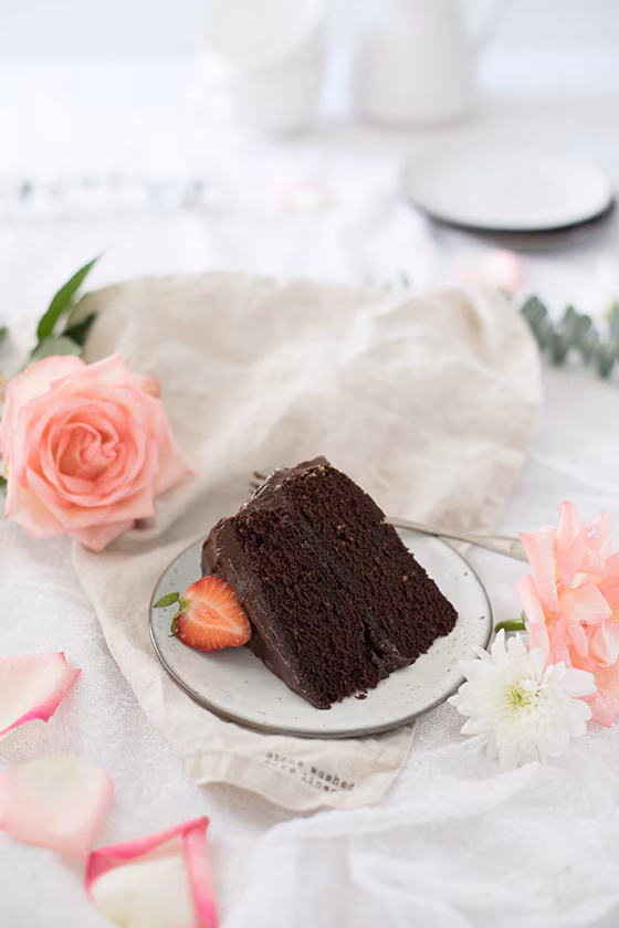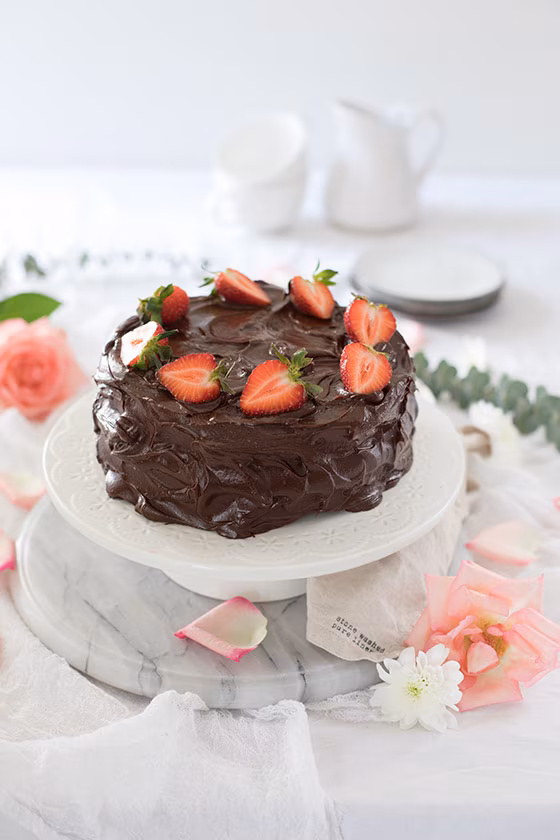 Olen kuullut paljon kehuja Nigella Lawsonin herkullisesta Devil´s food cakesta, joten päätin lähteä liikkeelle siitä. Muokkasin mitat mahdollisimman helppoon muotoon ja lisäsin tietysti ripauksen suolaa (koska suklaakakku vaatii aina ripauksen suolaa). Tarjoiluun lisäsin tuoreita mansikoita, mutta kakku kyllä katosi loistavasti ilman mansikoitakin.