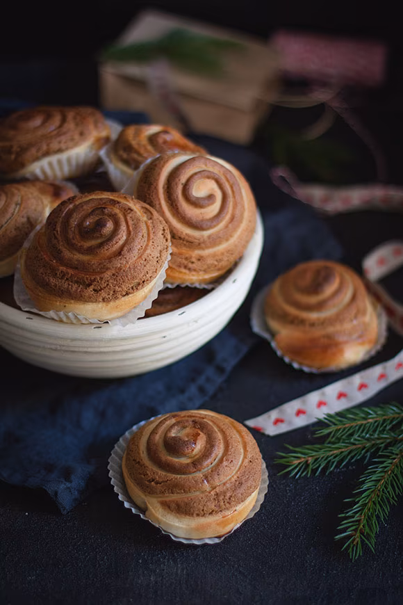 Aseta palat uunipellille paperivuokiin ja anna kohota leivinliinalla peitettynä vielä noin 40 minuuttia. Kuumenna uuni 200 °C:seen. Voitele pullien reunat kananmunalla ja paista noin 10–15 minuuttia tai kunnes pullat ovat saaneet kauniin värin.