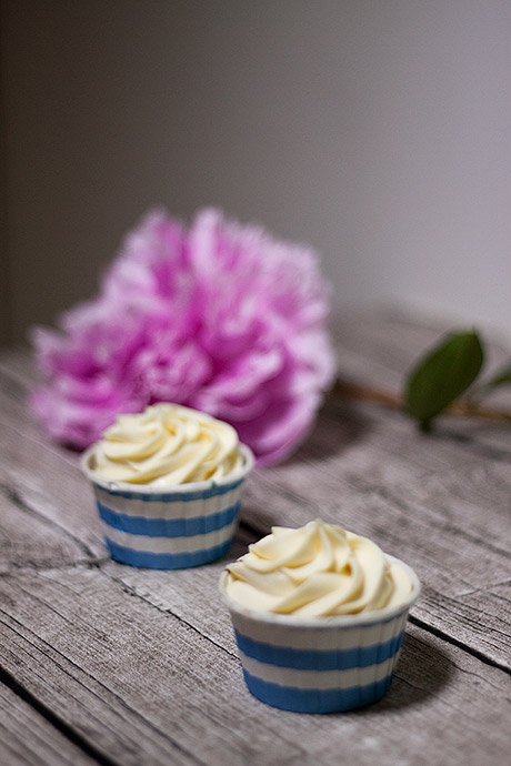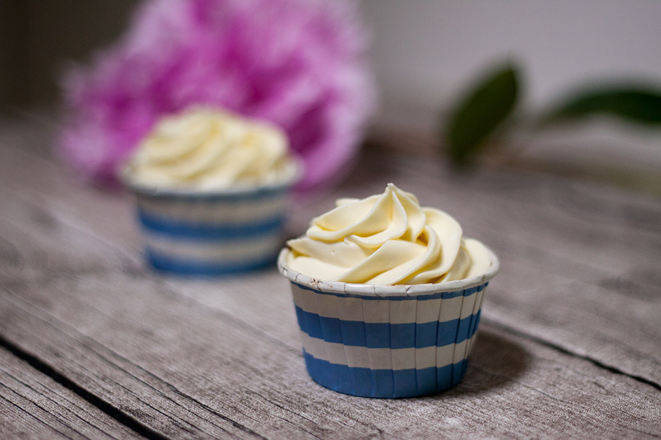 Jaa taikina vuokiin ja paista noin 20 minuuttia. Valmista kuorrute kuppikakkujen jäähtyessä.