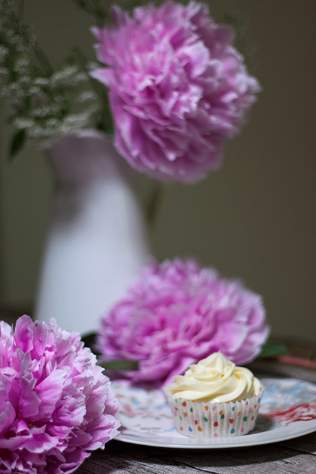 Viikonlopun ihastukseksi sain käydä vielä siskon pihalta hakemassa upeita pioneja. Ne ovat ehdottomasti yksiä lempikukistani. Laura oli laittanut niitä maitokannuun kuistille ja hienovaraisten vihjailujen jälkeen sain käydä napsimassa vähän kuvausrekvisiittaa. Olen viimeaikoina innostunut valokuvauksesta ja sommittelusta, kun aikaakin kuvauksiin tuntuu löytyvän jo paremmin. Tuntuu aivan ihanalta pyöritellä kukkia ja kakkuja ja miettiä miten niiden herkullisuus välittyisi parhaiten linssin toiselle puolen.