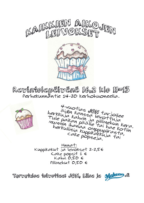 30. 01. 2014Ravintolapäivään osallistuminen on pyörinyt mielessä jo monena vuotena, mutta jotenkin se on aina jäänyt toteuttamatta. Tänä vuonna Jontsa on kuitenkin ollut niin tehokkaana apurina ja innokkaana kondiittorina, että päätettiin yhdessä laittaa ravintola pystyyn. Siis Makeaa-blogi ylpeänä esittää: