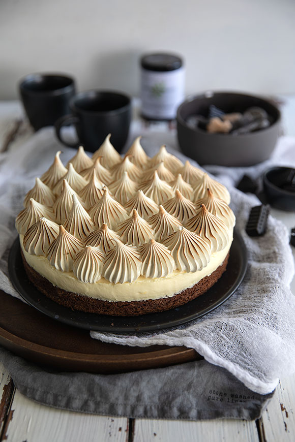 Ota kulho vesihauteesta ja vatkaa vaahto huoneenlämpöiseksi. Sekoita joukkoon lakritsijauhe. Siirrä vaahto pursotinpussiin ja pursota heti sitruunamoussen päälle. Ruskista halutessasi kaasupolttimella.