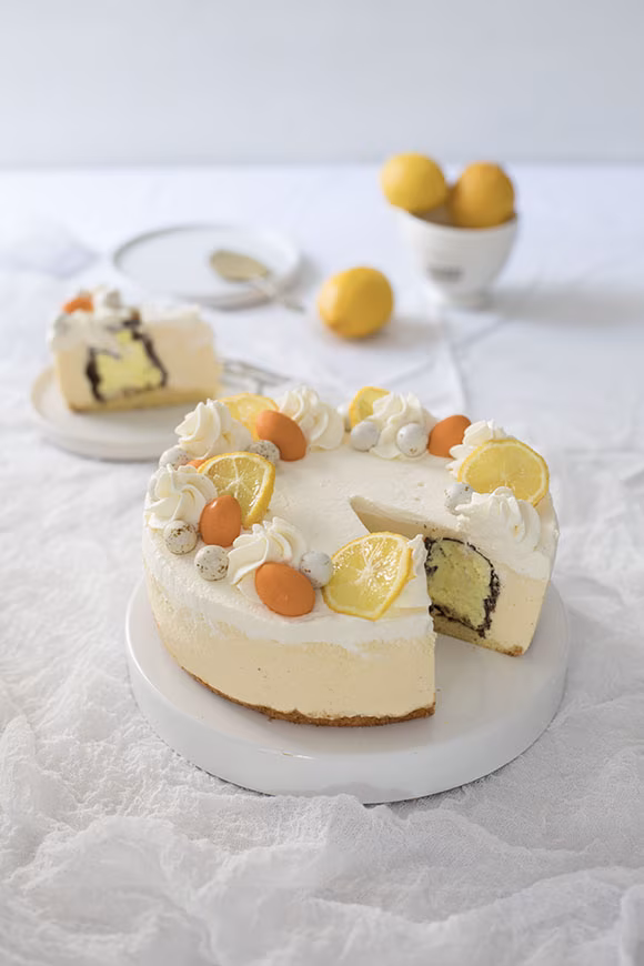 Ota kakku vuoasta ja aseta se tarjoiluvadille. Vaahdota kerma sokereiden kanssa kuohkeaksi vaahdoksi. Laita puolet kermasta tähtityllalla varustettuun pursotinpussiin. Levitä loput kermasta kakun päälle. Viimeistele kakku kermapursotuksin ja suklaa- sekä sitruunakoristein.
