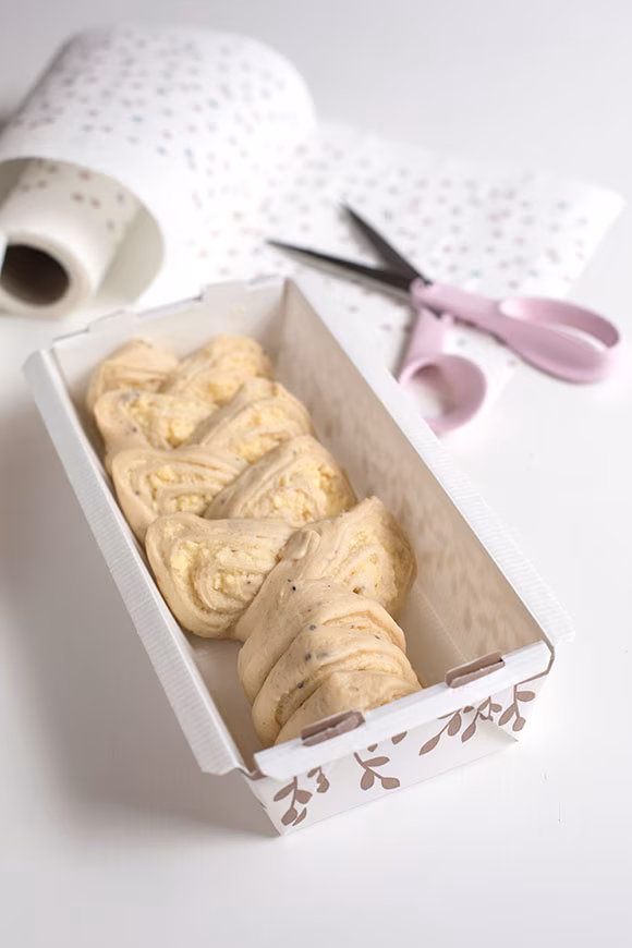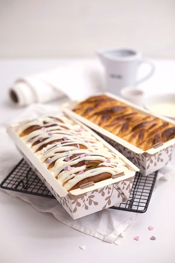 Kauli kohonnut pullataikina suureksi suorakaiteen muotoiseksi levyksi (50×60 cm). Levitä täyte taikinalle ja kieritä taikina rullalle. Leikkaa taikina kolmeen SAGA paistovuoan pituiseen palaan. Aseta palat paistovuokiin. Leikkaa rulliin saksilla pitkät viillot noin 2 cm:n välein. Käännä viillot vuorotellen eri suuntiin. Nosta vuoat uunipellille ja kohota liinan alla noin 45 minuuttia.