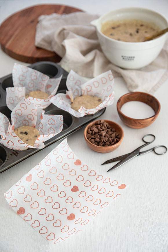 Koska itse muffini ei ole ehkä se näyttävin leivonnainen, päätin tehdä vaikutuksen muffinivuoilla. Taittelin vuoat SAGAn uudesta kuvioleivinpaperista ja mielestäni näistä tuli aivan ihanat. Käytän aina silloin tällöin muutenkin leivinpaperia muffinivuokina, se antaa mielestäni hauskan retkimäisen tunnelman ja muffini on ihana kääriä ulos paketistaan (vähän kuin saisi lahjoja).