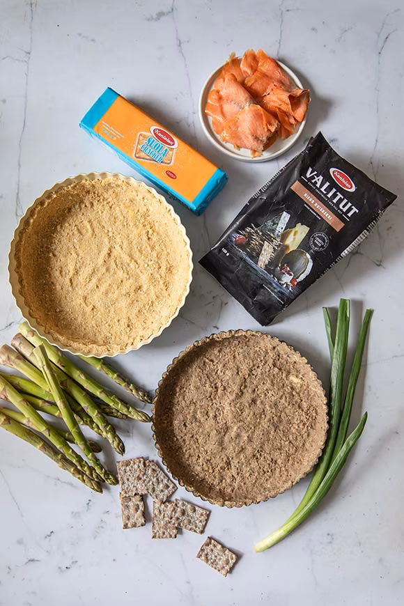 Kevään ja alkukesän sesonkikasvis parsa on täydellinen ja arvostettu herkku juhlapöytään. Maukkaassa, mutta silti lempeässä piirakassa parsa pääsee loistavasti esiin. Piirakan jujuna on herkullinen suolakeksikuori, joka nostaa pohjan aivan uudelle tasolle. Kun aiemmin piirakan pohja on ollut vain pakollinen kannatin, nyt se tuo herkullisen lisän niin piirakan makuun kuin rakenteeseenkin. Kantolan suolacracker -suolakeksit ovat juuri sopivan suolaisia, jotta pohja maistuu reilusti ja antaa riittävän vastuksen parsalle.
