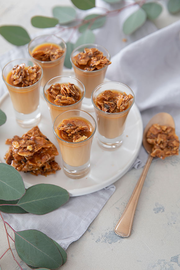Laita liivatteet pehmenemään kylmään veteen. Kuumenna kerma kattilassa kiehuvaksi. Purista liivatteista ylimääräinen vesi pois ja liuota ne kermaan. Lisää kondensoitu maito ja suola. Kaada seos pieniin annoslaseihin ja anna jähmettyä jääkaapissa noin 3 tuntia.