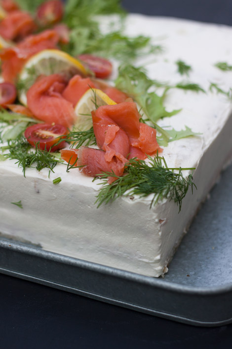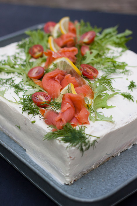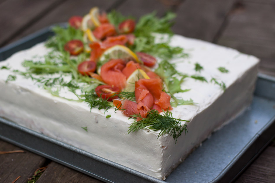 Viime viikonloppuna vietettiin Jonin 5-vuotis synttäreitä. Suolaisena tarjottavana oli porotuulihattujen ja karjalanpiirakoiden lisäksi lohivoileipäkakkua. Mitoitin kakun noin 20 henkilölle ja se tekikin kauppansa ihan loistavasti. Tein erittäin helpon ja nopean täytteen kakkuun, sillä olin taas hamstrannut niin monta muutakin hommaa, että kakun kanssa tuli kiire.
